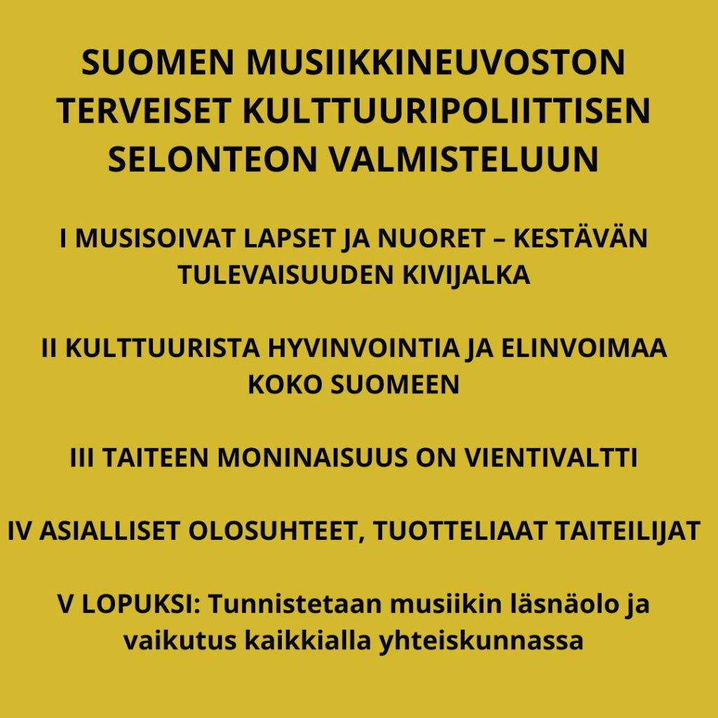 SUOMEN MUSIIKKINEUVOSTON TERVEISET KULTTUURIPOLIITTISEN SELONTEON VALMISTELUUN